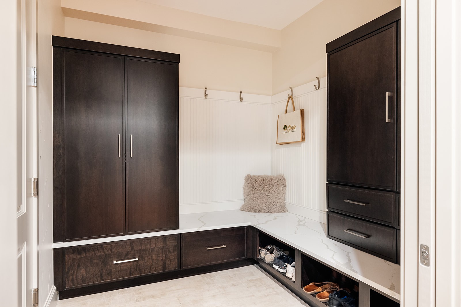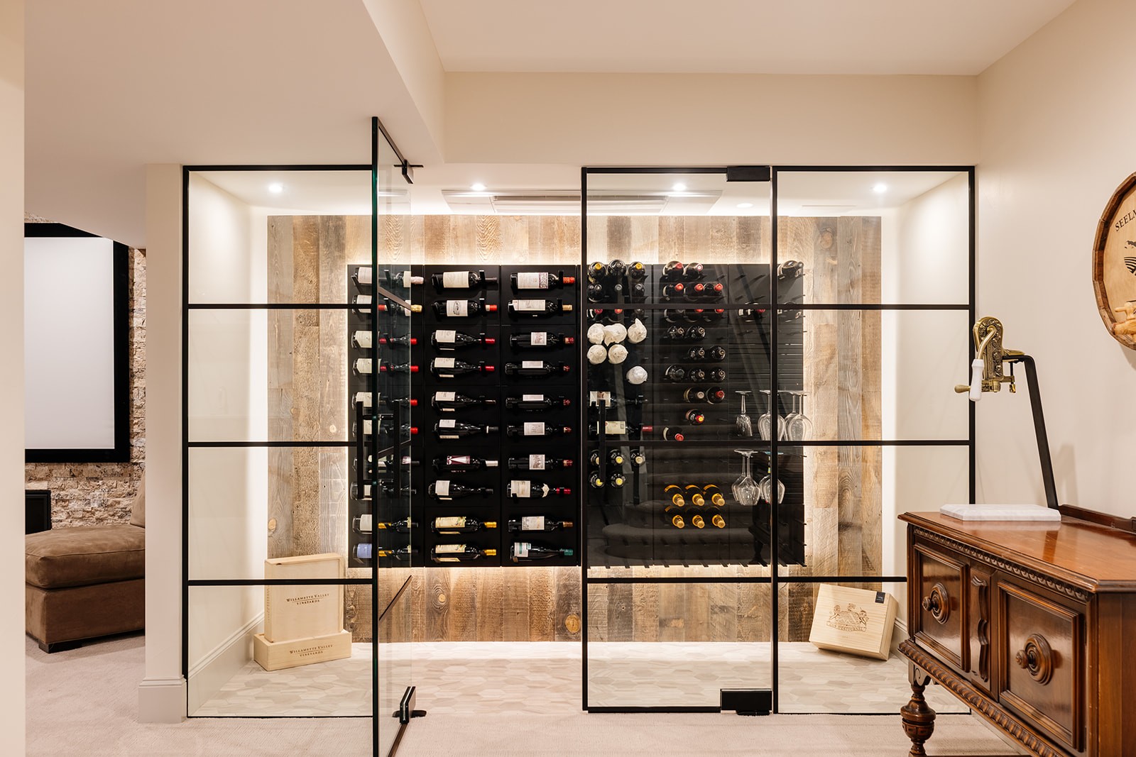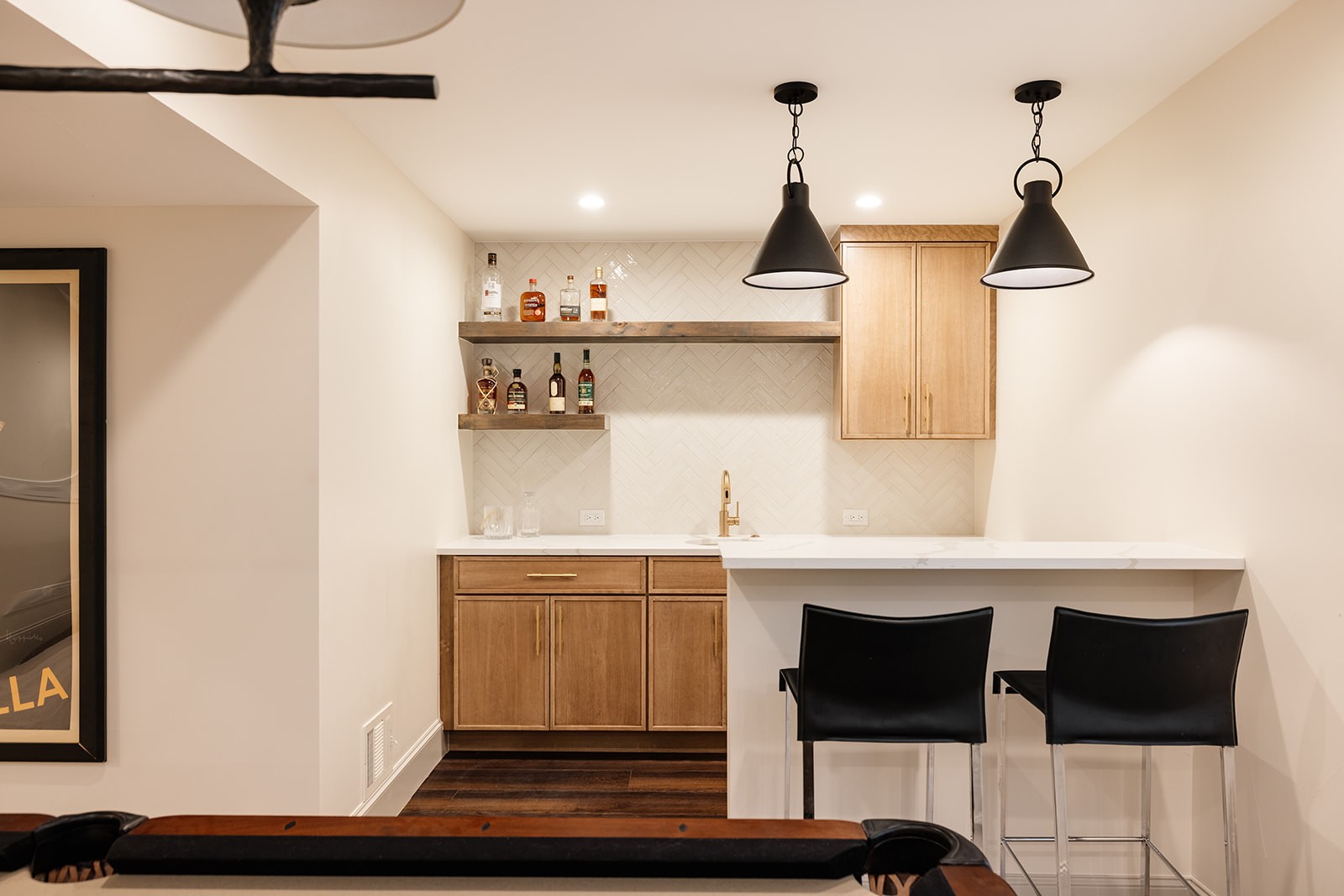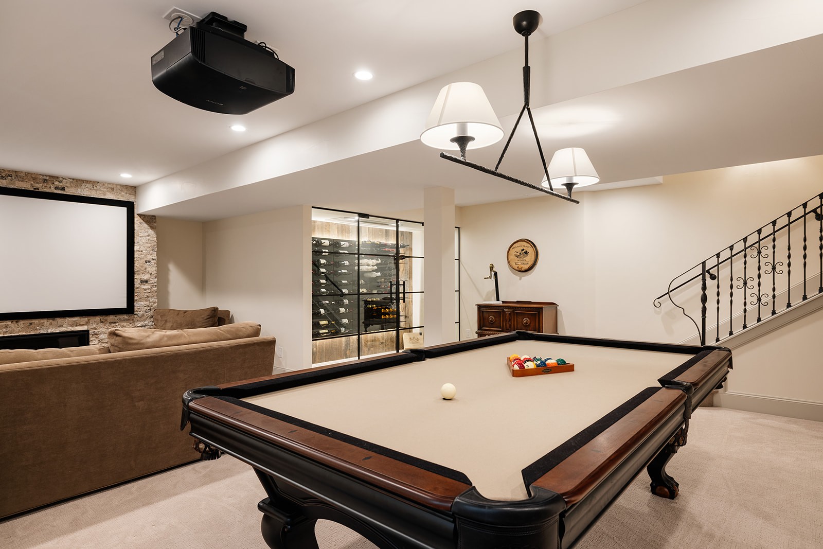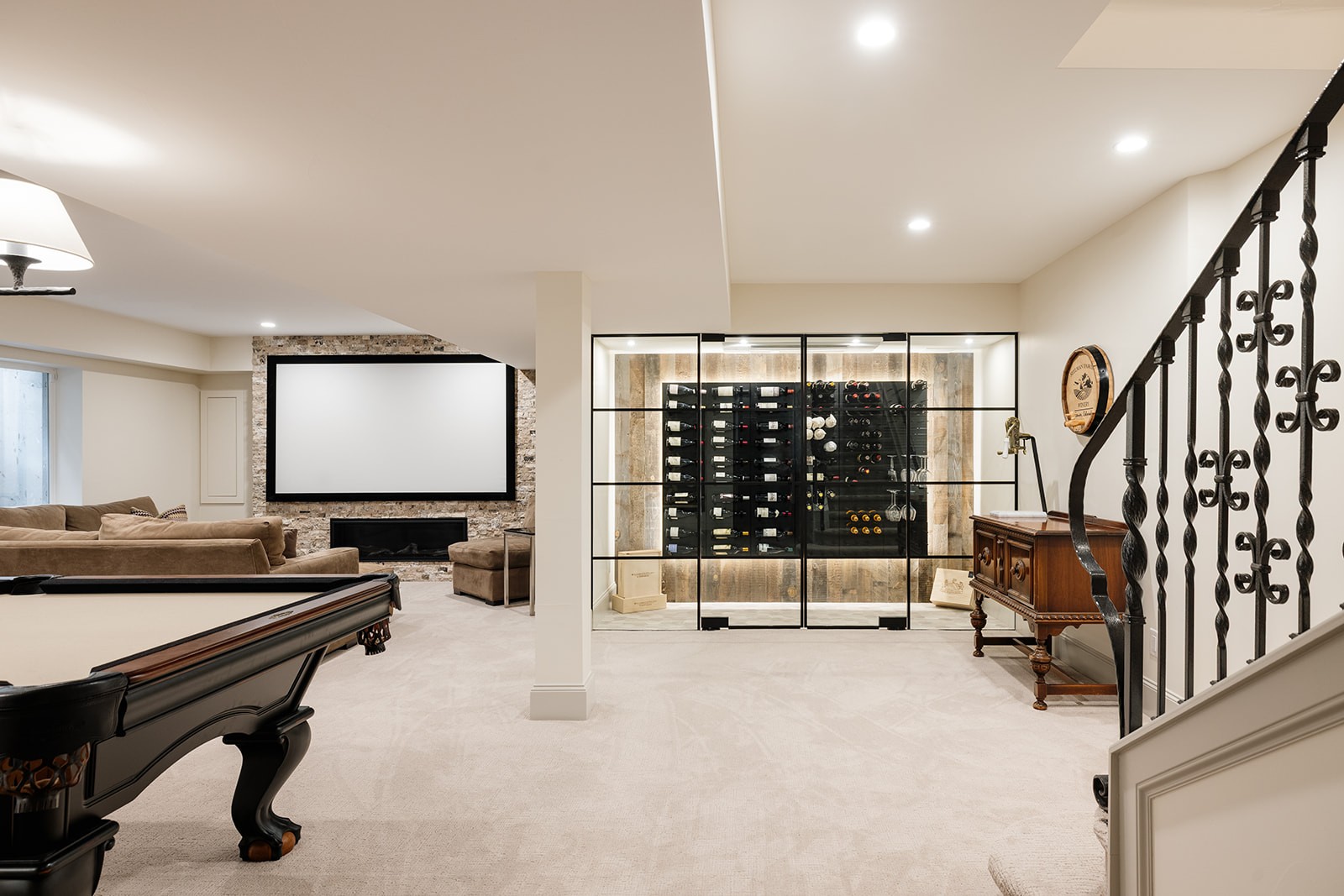 This project tackled a major design flaw: a partially finished basement with an awkward layout where stairs descended directly into a bedroom. Working closely with clients who envisioned better flow and functionality, we completely reversed the floor plan. The transformation created a stunning entertainment focal point with a large pool room, wet bar, and wine room, while relocating the bedroom suite to a more private back location. We also converted unfinished storage space into a custom gym with glass doors. Beyond the basement, the project included a mudroom renovation, three guest bedroom updates, and refinishing all hardwood floors plus carpet replacement throughout. The result is a cohesive home that truly fits this family’s lifestyle and entertaining needs.
