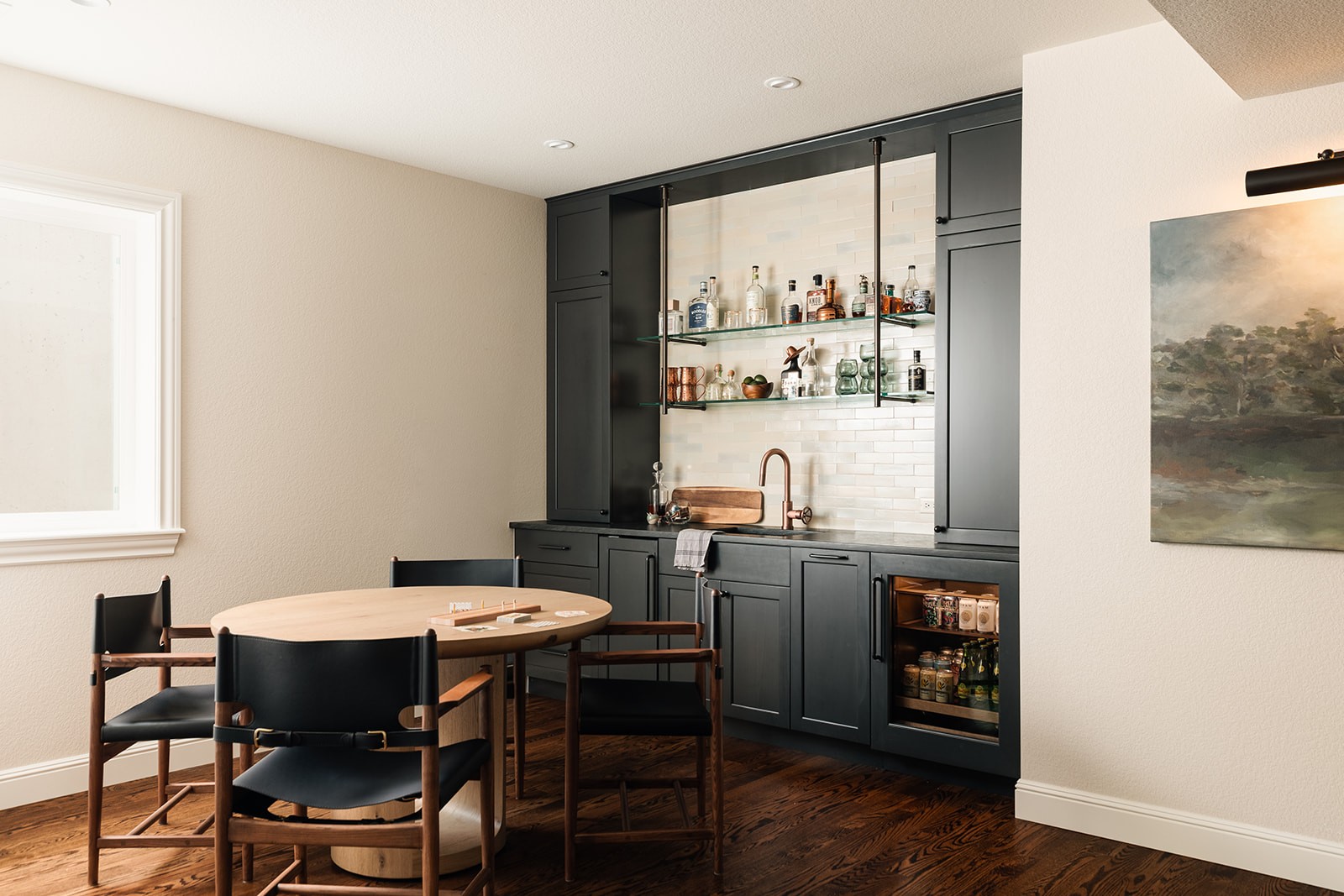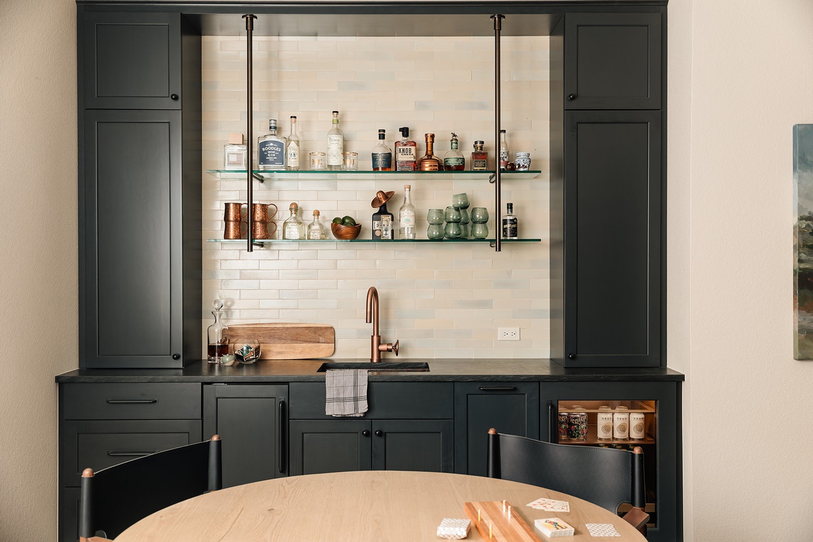 The centerpiece of this project is a stunning custom wet bar featuring deep green shaker-style cabinetry, complemented by white subway tile backsplash and elegant glass floating shelves suspended by oil-rubbed bronze hardware. The space combines functionality with refined aesthetics—copper fixtures, dark countertops, and thoughtfully integrated storage create an entertaining area that rivals any upscale home bar.