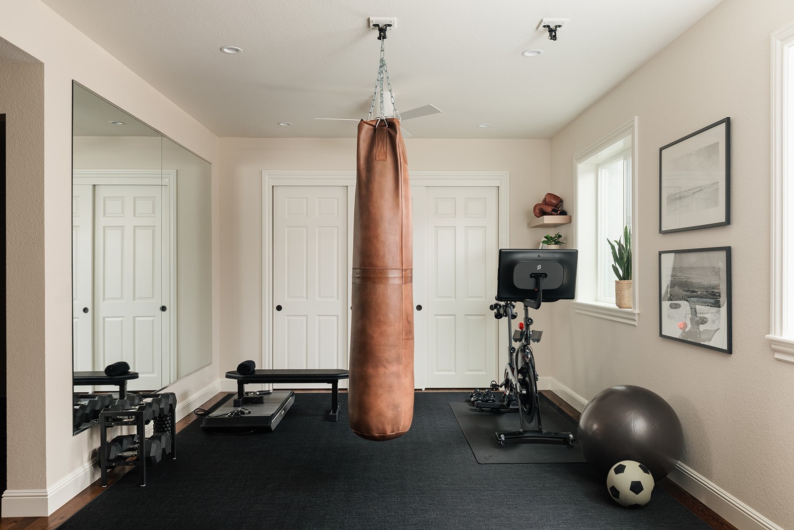 Adjacent spaces demonstrate how modern basements can serve diverse lifestyle needs. A dedicated fitness area features professional-grade rubber flooring, mirrored walls for form checking, and ceiling-mounted equipment stations—bringing the gym experience home without sacrificing design quality.