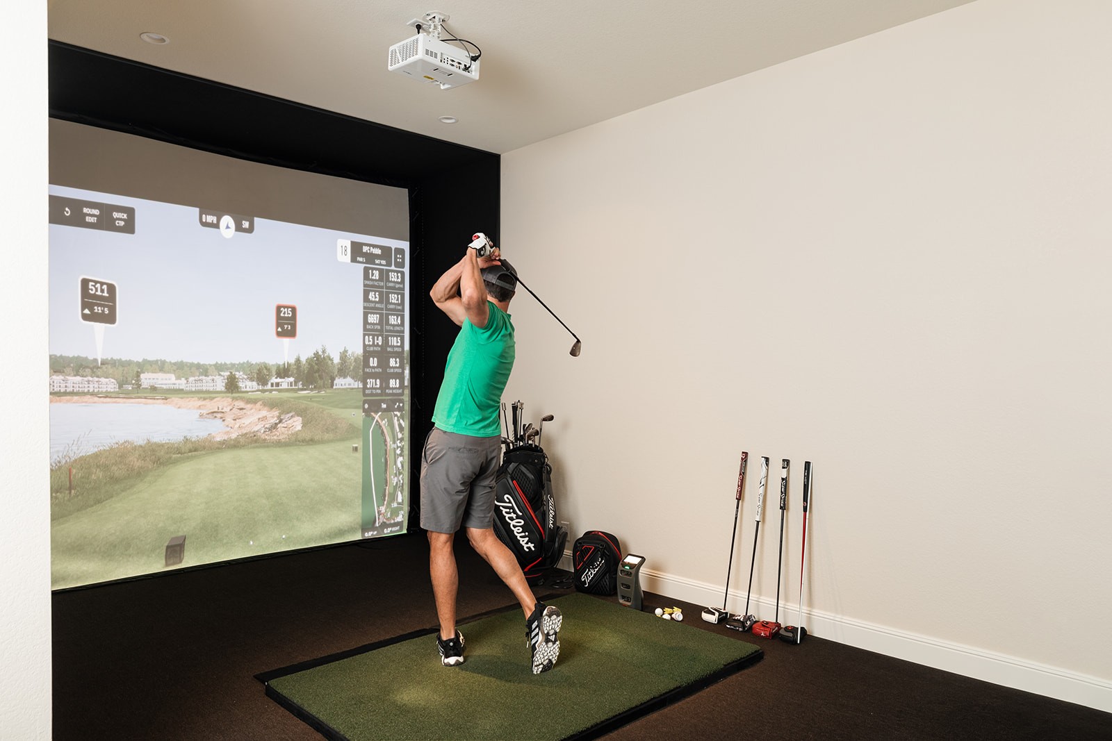 The renovation culminates in a state-of-the-art golf simulator room, complete with impact screen, professional turf, and ambient lighting—allowing year-round practice. For this project the basement floor was structurally lowered in this section.
