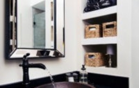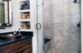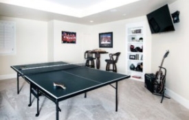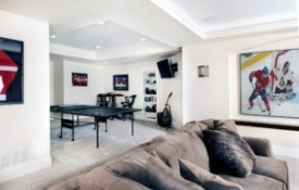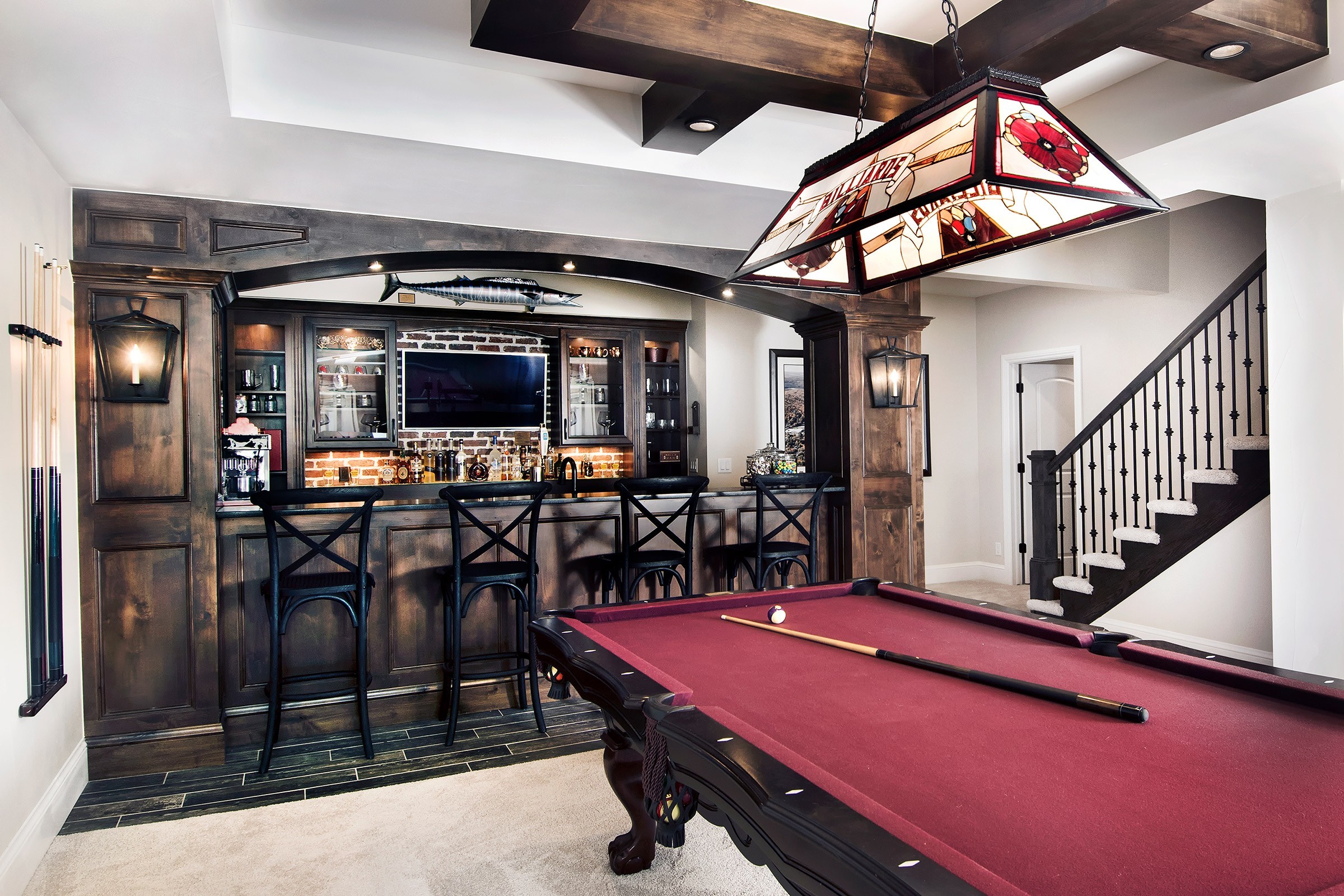 The basement remodel was all about entertaining, centered around a custom wet bar. With a design that featured paneled columns, an arched brick backsplash and space for multiple beverage fridges (as well as a beer dispenser for three kegs!) the result was an inviting, pub-like aesthetic. The redesigned space also includes a 300-bottle wine cellar and custom wine rack, as well as a bookcase door and a barn door, adding a layer of playful charm to this relaxed gathering space.
