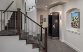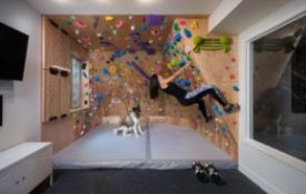 This basement was one fun project both to design and build! The family that lives in this home is very active, so the basement reflects their lifestyle with two workout rooms. One workout room (not shown) houses all of their workout equipment and wall mirrors while the other workout room has a dedicated climbing area in half the room, and space for floor workouts in the other half.