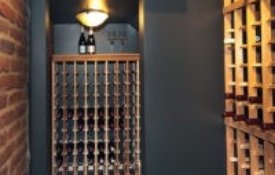 The clients chose to install multiple under counter appliances including a wine refrigerator, beverage center, and dishwasher. The glossy slab front drawer bases bring a European feel to the space with their adjustable feet, which makes for easy cleaning! The thin quartz counters, pendant lights and bar stools all come together to make the space feel clean and contemporary. The black painted walls lead to a modern take on a wine cellar, with a hallway full of wine and a private stash room in the rear. The oversized black tile floors in the wine room blend well with the dark luxury vinyl tile throughout the basement.