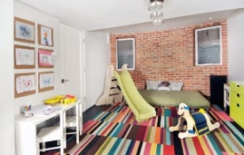 This fun basement came together with mixed media materials and sleek contemporary fixtures.