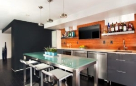 This fun basement came together with mixed media materials and sleek contemporary fixtures. The exposed brick wall and wood backsplash tile bring a combination of texture and color into space. Two floating shelves on either side of the wall mounted television hold oversized liquor bottles and also shine task lighting onto the counter. The frosted glass wall cabinet provides extra storage while complementing the sleek glass top dining table.