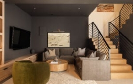 The simple finished basement with white walls and soaring 10′ ceilings, became the foundation for an ambitious design.