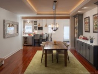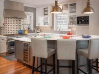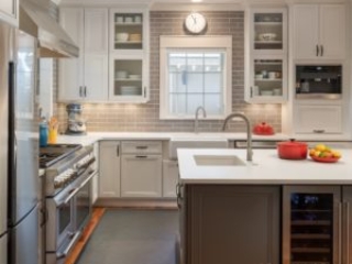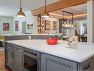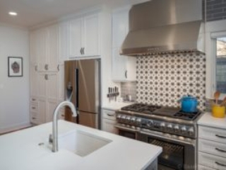 This kitchen remodel was part of a main floor enlargement, thanks to a new addition at the back of this 1949 Montclair home. The former exterior wall was replaced by an engineered beam and we relocated the back door to create a more seamless transition to the outdoor patio for entertaining. Inside, the new chef-worthy kitchen was also outfitted with two different sinks (one for dishes and another for produce), as well as a double oven, wine fridge and a built-in coffee station.