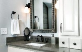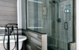 Basements & Beyond was able to achieve variety and consistency within the same tile. The herringbone pattern seen in the floor tile makes for a fun yet elegant space, while the horizontal and vertical lay of the shower makes the space feel both wider and taller. The black hexagon shower floor tile is carried through in a vertical decorative strip in the shower, which complement the black hardware seen throughout the bathroom.