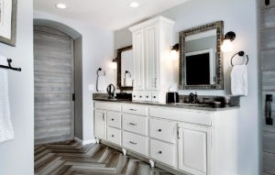 Some unique elements of the shower include a linear drain and glass shelved shower niche. The shallow shower bench allows for more foot space within the shower while making for a perfect foot stool, seat, and shelf. The oversized double vanity features quartz countertops, his and hers rectangular undermount sinks, and black fixtures. The added vanity feet make the cabinets feel more like a furniture piece. The tower cabinet sitting on the counter is perfect for storage and keeping countertops clean. The ornate mirrors and sconces are both eclectic and elegant and complement the bathroom components perfectly.