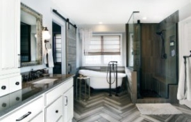 This stunning Lowry master bath remodel is a perfect balance of both masculine and feminine features with dark tiles and a tiered glass chandelier. The standalone claw foot tub makes for a perfect focal point as you enter the room. The rustic sliding barn door is a great alternative for a hinged door by eliminating the space needed for a door swing. By installing the dark plank tiles in three different lays,