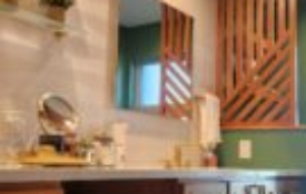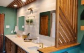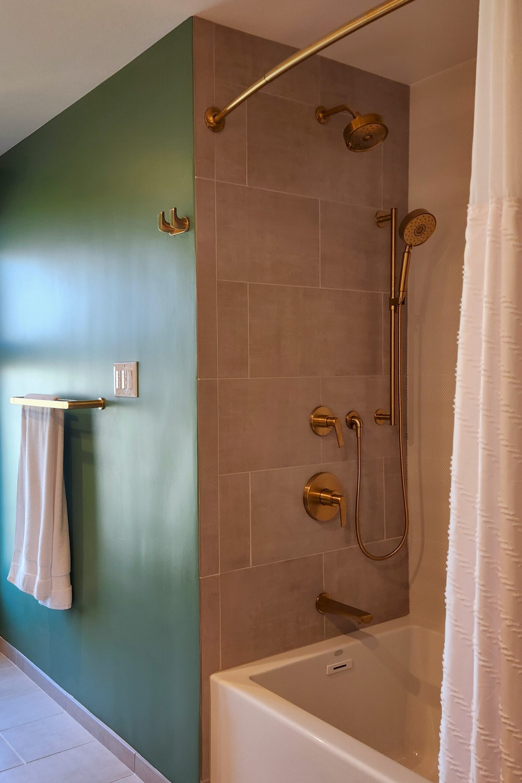 Inspired by natural elements and architectural elegance, this Hilltop bathroom remodel draws subtle parallels to New York’s High Line Park. Soft green walls evoke the lushness of urban greenery, bringing a sense of tranquility and natural beauty into the space. The rich stained trim detail, extending gracefully from a pony wall to the ceiling, serves as a striking focal point—a quiet homage to the bridges and pathways that define the iconic park. The result is a sophisticated yet serene retreat, where organic tones and structural details seamlessly blend into a refreshing oasis.