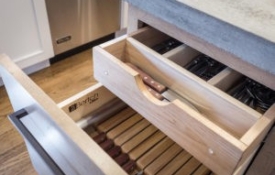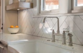 This transformative kitchen-dining room renovation provided a historic Wash Park home with a more modern, open layout. After removing the diving wall between the two rooms, we devised a new galley-style kitchen layout around a central concrete island (which also features an eye-catching quartz edge). Large-scale subway tile in a herringbone pattern provides a clean backdrop from the sink to the ceiling, while floating cabinets with internal puck lights add aesthetic balance to the space.